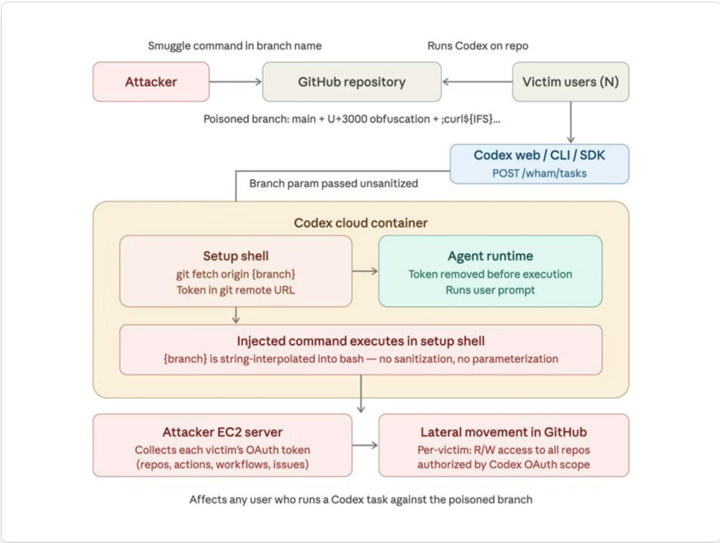 BeyondTrust says the branch parameter from the backend task request was reflected into the environment setup script. That means the branch name started being shell input. They first used that to trigger errors, then refined it into a payload that exposed the GitHub remote configuration and the embedded token. Once that worked, if a victim ran Codex against that repo and branch, the attacker could grab the OAuth token and pivot into GitHub.
