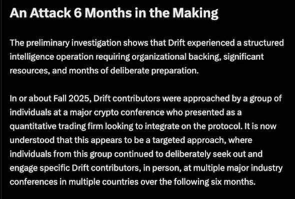 This one was crazy. This $280 million crypto theft was a six-month-long op. Drift experienced a structured intelligence operation that required organizational backing, significant resources, and months of deliberate prep. Contributors were approached in person at conferences, engaged across multiple countries, and worked with what appeared to be a legitimate trading firm that built trust over half a year.