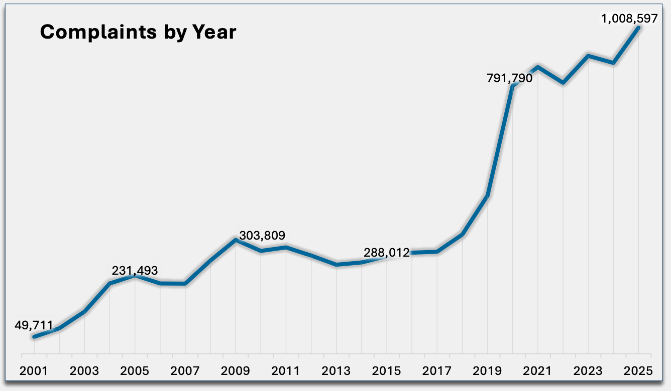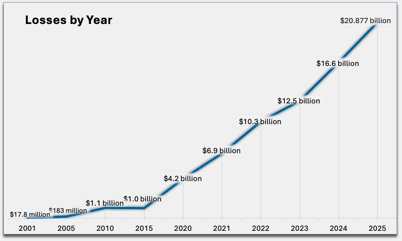 The Internet Crime Complaint Center, otherwise known as IC3, put out their yearly report and it's always staggering to see how the number of complaints per year is just straight up and to the right. These are people who lost stuff in cyberattacks, scams, whatever it is, and actually called and reported it. Which is not everyone, by any means.