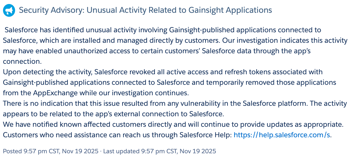 Salesforce is dealing with another supply chain incident after hackers breached customer data through Gainsight, a third-party customer management platform. ShinyHunters is claiming responsibility and threatening to leak data from nearly a thousand companies unless Salesforce plays ball with their extortion demands. Salesforce is doing the classic "not our fault, it's the third-party integration" dance, saying the breach came through Gainsight's external connection rather than their own platform.