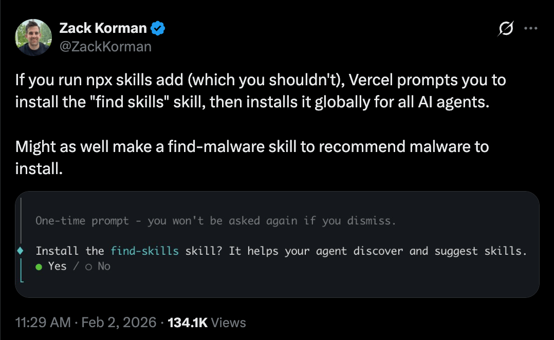 The running untrusted skills is one of the scarier parts for me personally. Itâs the main way people are interacting and giving this thing âtoolsâ and it also has the chance to just go and do this itself. Oh and prompt injection is a serious concern. (read more)